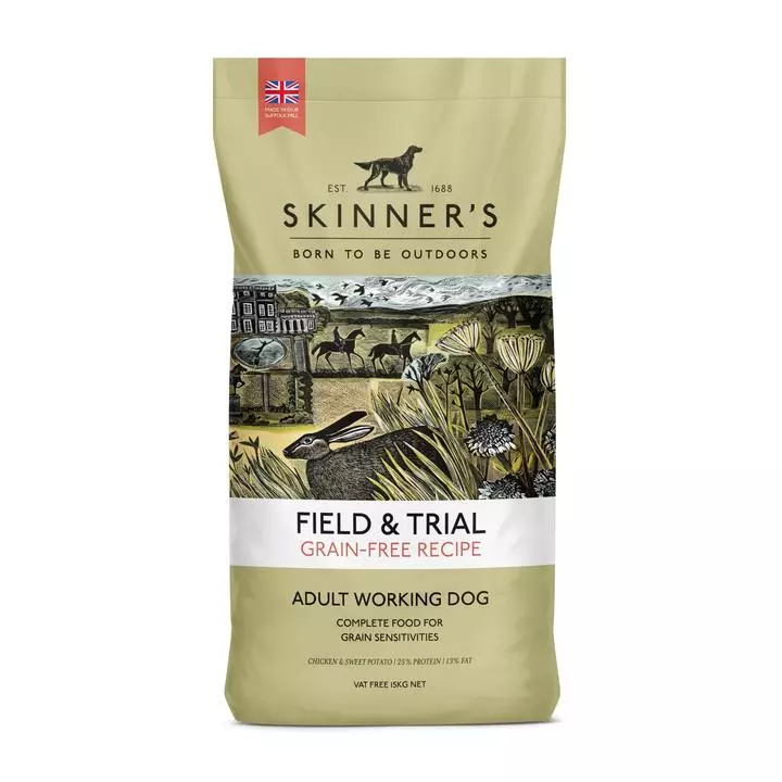 November 13, 2023Skinner’s Field & Trial Chicken and Sweet Potato is a complete, grain-free dog food, specially developed and formulated to support working dogs who are regularly working at a moderate activity intensity. Skinner’s Chicken and Sweet Potato dry dog food has been carefully developed to support the energetic requirements of a range of active dogs, while removing grain-based sources of carbohydrates.